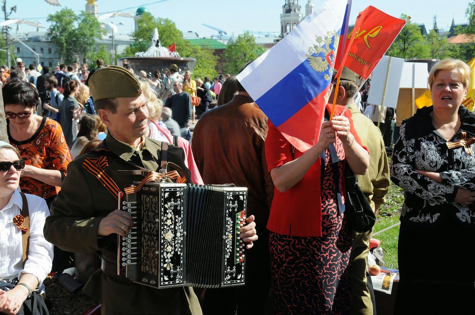 Images from the 2014 Victory Day celebrations in Moscow: military hardware parade along Noviy Arbat; images of World War II ("Great Patriotic War") veterans in Gorky Park; statues from the Soviet period; close up of Peter the Great statue; towers of the Kremlin; St. Basil's; Red Square decorations; laying flowers at the War Memorial in Alexander Gardens; miscellaneous images near the Bolshoi Theater. These are just a very few photos from a very full day.